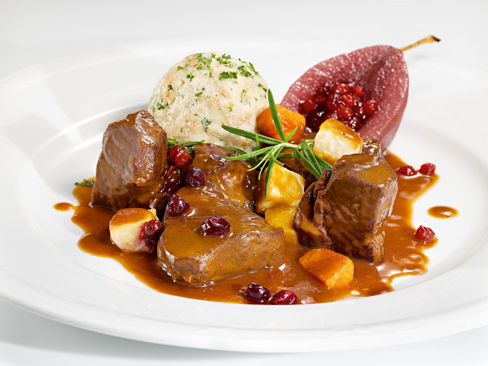 saftige Stücke vom Hirschschlögel in feiner Wildsauce, serviert mit Serviettenknödel, hausgemachtem Apfelrotkraut und Rotwein-Preiselbeerbirne