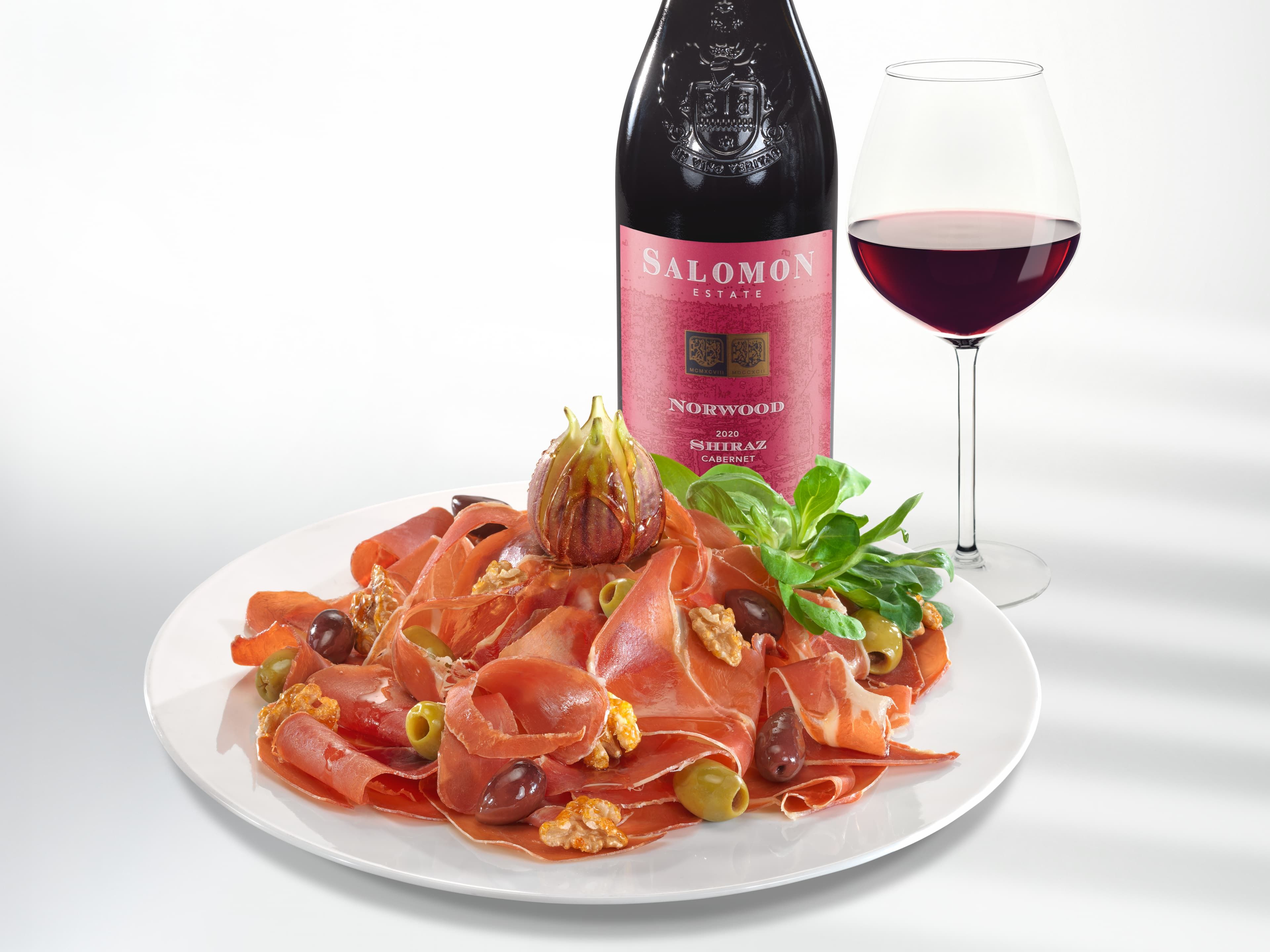 Hauchdünn geschnittener, luftgetrockneter Schinken vom Ibérico-Schwein, 36 Monate gereift, saftig und intensiver Geschmack nach Steineicheln, lauwarm serviert, garniert mit karamellisierten Walnüssen, Oliven und Honigfeige