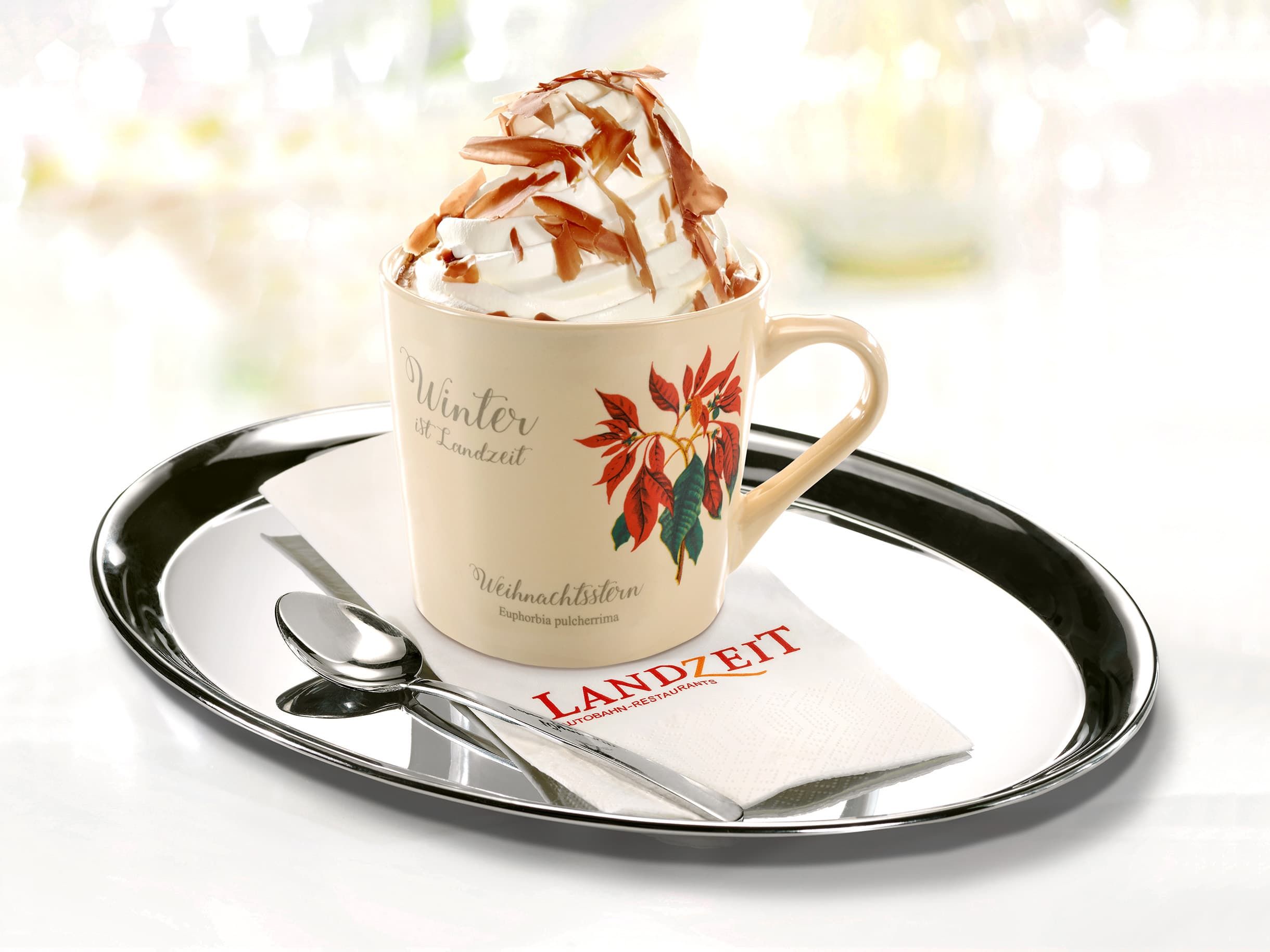 Hausgerösteter Filterkaffee mit aufgeschäumter Milch, Schlagobers und Schokoladenstreusel. Bei der Bestellung einer Landzeit Kaiser-Melange erhalten Sie die Tasse mit Frühling-, Sommer-, Herbst- oder Wintermotiv als Geschenk!