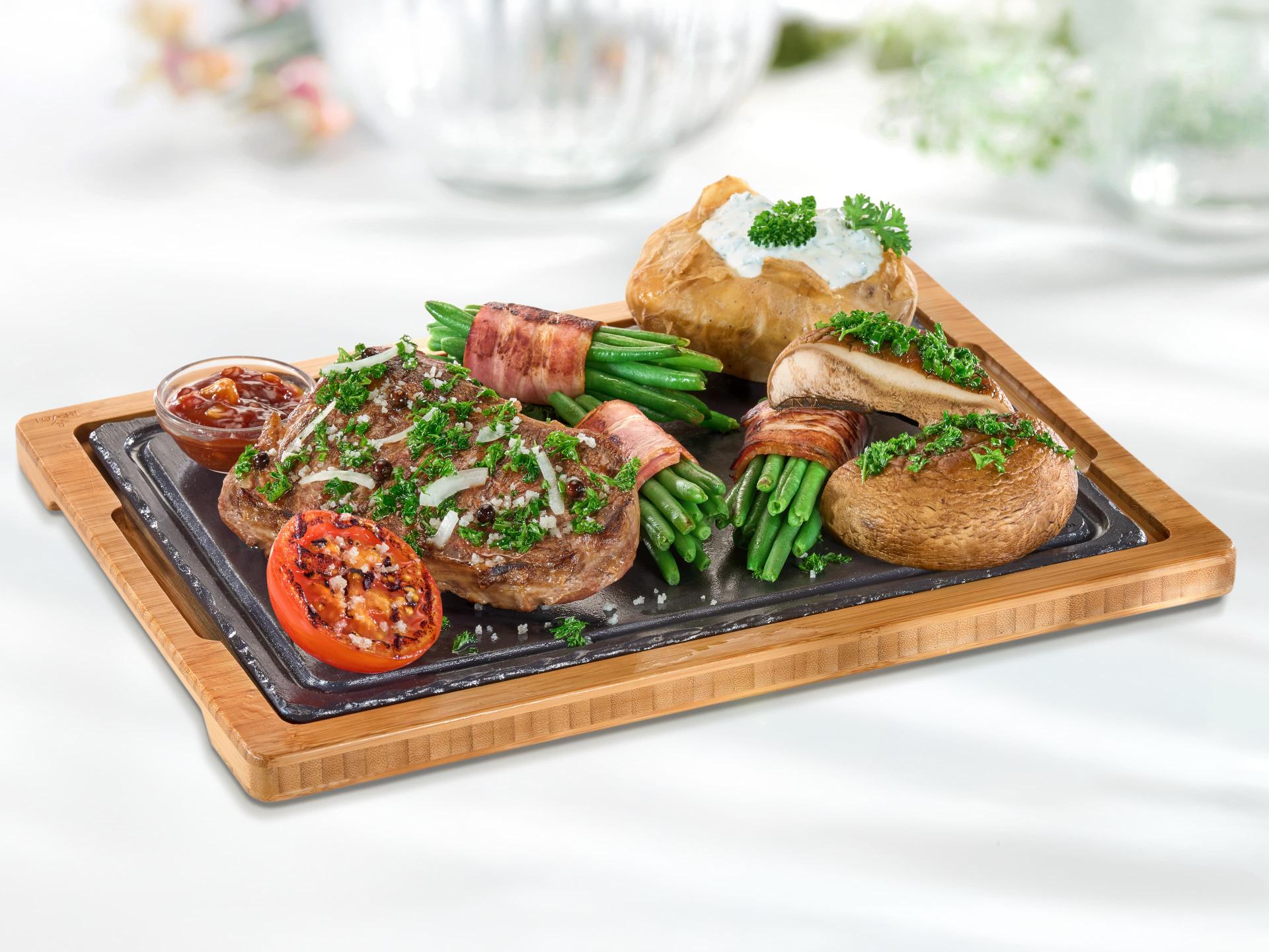besonders zart und saftig, vom Flammengrill, mit hausgemachter Steakmarinade und Guérande-Meersalz gewürzt, gegrilltem Portobello-Champignon in feiner Kräuter-Olivenöl-Marinade, auf Schieferplatte, serviert mit