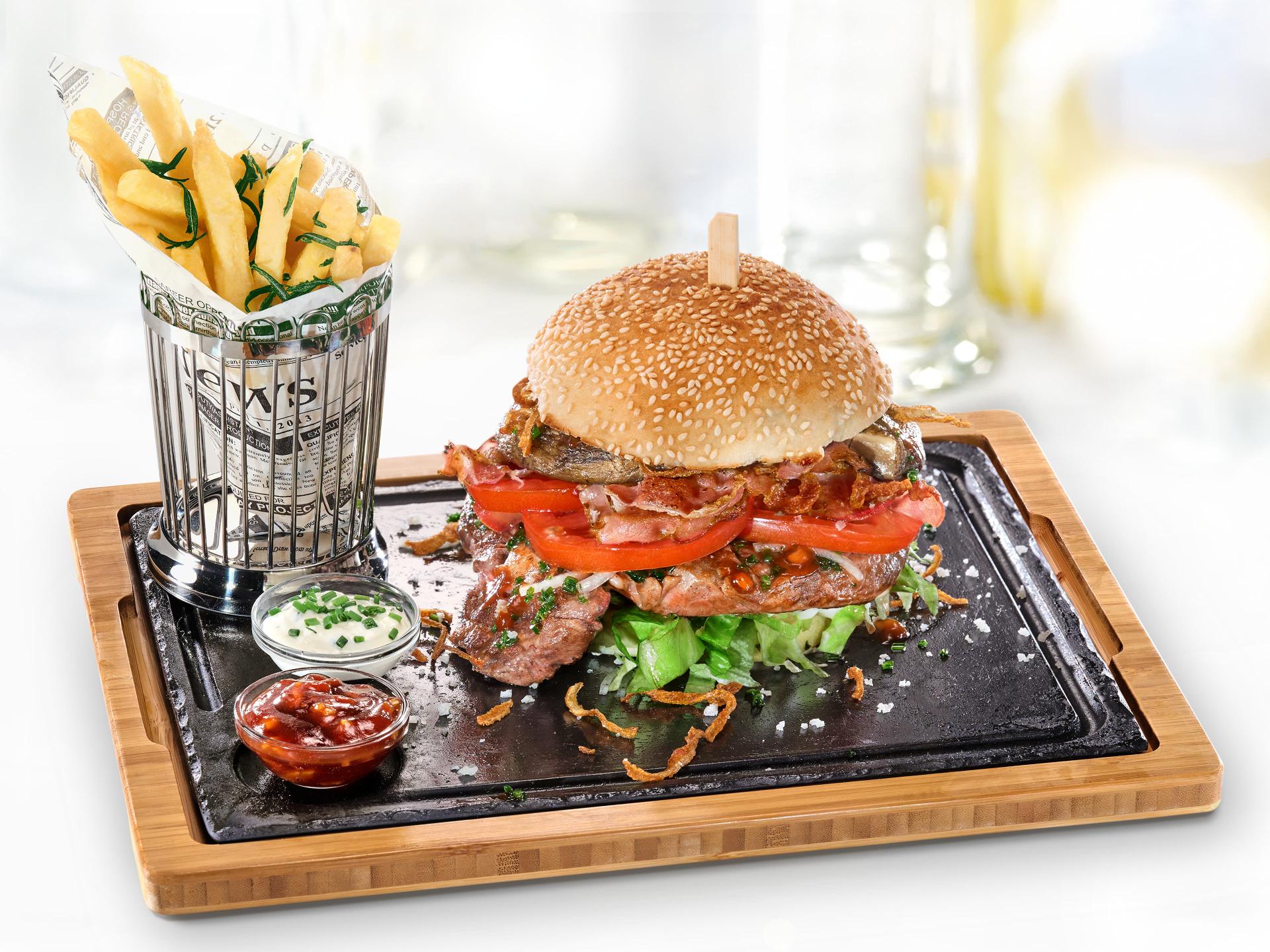 saftig gegrilltes Entrecôte 150 g, fein mariniert, gegrillter Portobello-Champignon, gebratene Speckscheiben, Eisbergsalat, Ochsenherztomaten, Röstzwiebeln, Landzeit-Barbeque-Sauce und Sour Cream-Sauce, serviert mit Rosmarin-Pommes frites